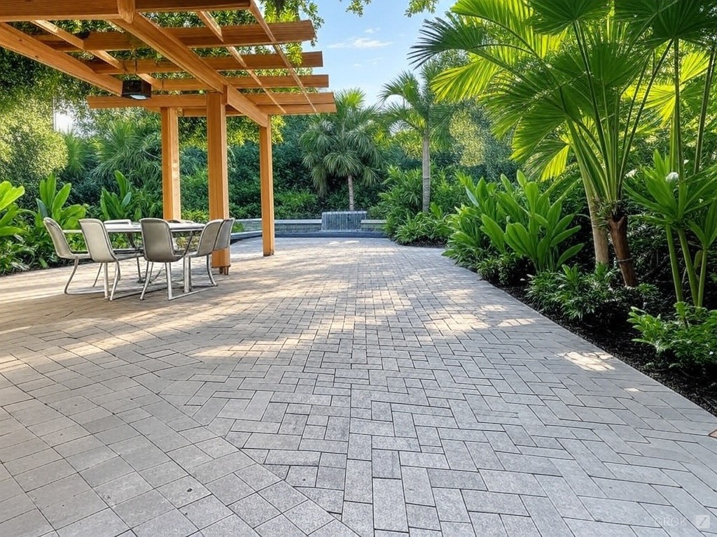 Materials like travertine, brick pavers, and stamped concrete are ideal for weather resistance and longevity.
