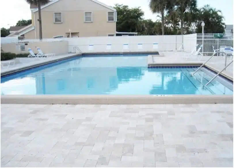 Travertine is durable, heat-resistant, and offers a luxurious aesthetic, making it ideal for pool deck remodeling Miami.